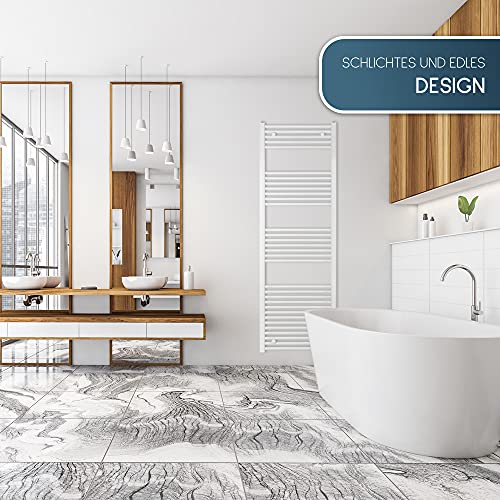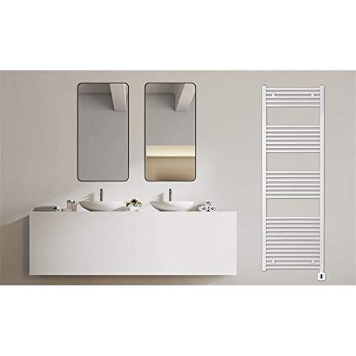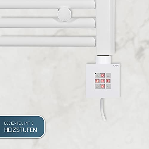 Elektrische badkamerradiator afmetingen: 1755h x 600b (mm) wit/recht, stroomverbruik verwarmingspatroon: max. 1000 watt, voldoende voor ruimteafmetingen: ca. 9 m². Bedieningspaneel met 5 warmtestanden tussen 30 °C en 60 °C. incl. 2-uurs timer, naar wens gaat de radiator na 2 uur automatisch uit. (Wasdroogfunctie, Boost 2-uur-modus)
