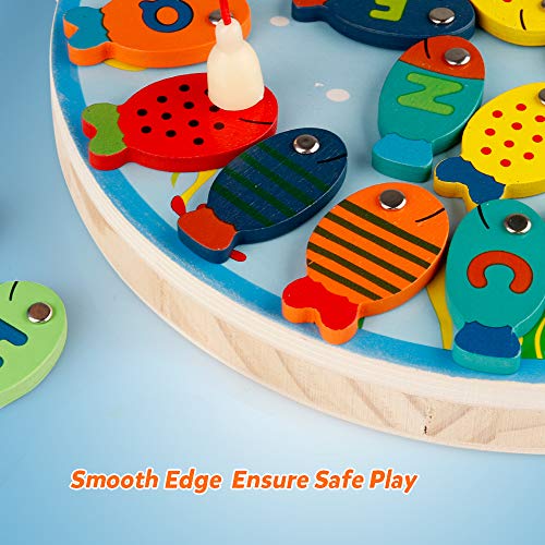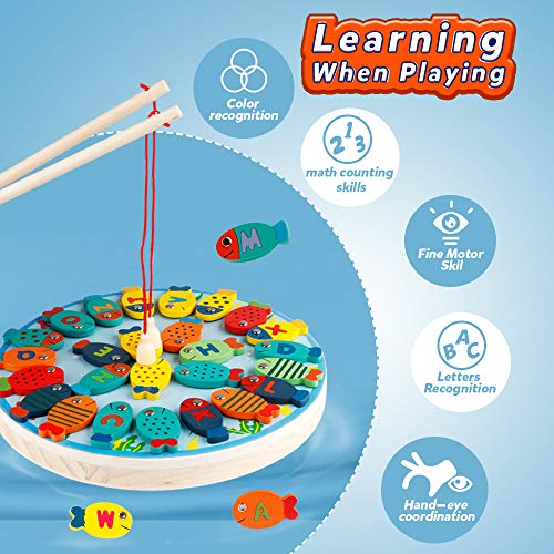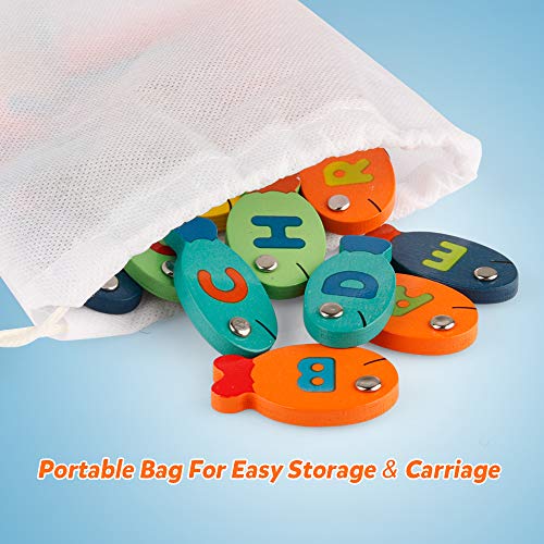 Coogam Vissende speelgoedset:Houdt uw kleintje van vissen? Fatsoenlijke doos wordt geleverd met 26 stuks magnetische houten alfabetvissen met verschillende felle kleuren, 2 x magneetstokken, 1 x vissen opbergtas, 1 x kattenpop met magneet, inclusief houten visspeelbord.