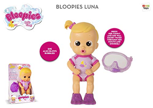 Maak kennis met de bloopies, je nieuwe vriendinnetje voor in bad. Bloopie luna spuit water uit haar mond of uit haar snorkel wanneer je in haar buikje knijpt. De bloopies kunnen zelfs bubbels blazen als je met hen in het bubbelbad speelt. Neem luna mee naar het strand of zwembad en ga samen met haar zwemmen. Er zijn verschillende personages te verzamelen, elk met hun eigen unieke badpak, zwemvliezen en snorkel. Badtijd wordt nog leuker met de bloopies. Afmeting pop: 9x9x24 cm (lxbxh) leeftijdsindicatie: 18 maanden+.