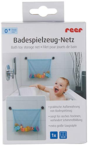 Met het lichtblauwe speelgoednet voor de badkuip van Reer zijn baby’s badspeelgoed altijd goed opgeborgen