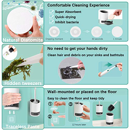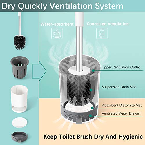 [Sneldrogende Toiletborstelhouder] De binnenkant van de stevige PP toiletpot reinigingshouder is voorzien van een holle ophanging en een verwijderbare ademende lade, die goed geventileerd is en vloeistof laat uitlekken en de siliconen opzetborstel worden beschermd. De aangepaste basis van de WC-borstel en houder heeft een diatomeeën modder en verborgen ventilatieopeningen maken het mogelijk dat het water op de borstel sneller kan verdampen en er zal nooit schimmelen of vieze geur afgeven.