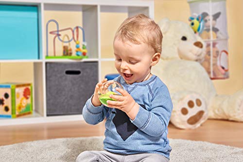 Met ABC spelenderwijs de wereld ontdekken. ABC wekt met leeftijdsvriendelijke producten de nieuwsgierigheid van baby’s en peuters van 0 tot 36 maanden en ondersteunt daarbij de ontwikkeling in de eerste levensjaren. Spelenderwijs worden de eerste leerdoelen bereikt, vormen en structuren ontdekt en coördinatiepatronen worden getraind. Zwemplezier met de ABC grijp- en badbal. De transparante bal is gemaakt van flexibel materiaal, waarin een kleine schildkap en kleurrijke rammelbal drijft. Of het nu gaat drijven op het wateroppervlak of over de vloer rollend is de kleine schildpad altijd in het oog. Door de afmetingen is de bal ideaal voor kleine kinderhanden, bevordert de motoriek en stimuleert de beweging. De grijp- en badbal heeft een diameter van 8 cm en is geschikt voor kinderen vanaf 12 maanden.