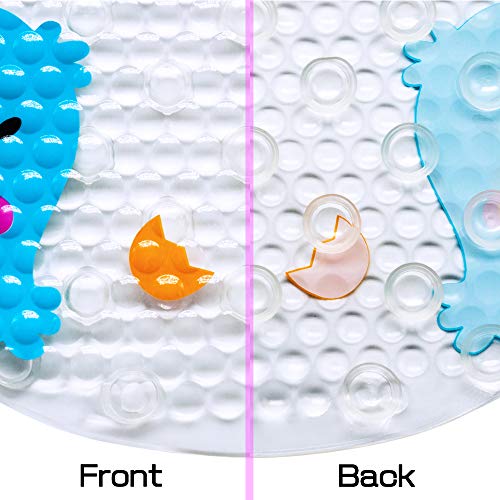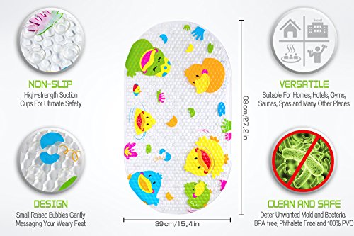 Antibacterieel materiaal voor kinderen: antibacterieel en bestand tegen meel, BPA-vrij, niet giftig, ftalaatvrij, latexvrij, geen giftige geur. Heavy-duty en standaard afmetingen en ovale vorm laat het plat in gladde badkuipvloeren liggen.