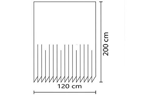 De afmetingen van het douchegordijn bedragen 120 x 200 cm (200 cm lengte – 120 cm breed) Materiaal: 100% polyester hoogwaardige stof 85 g/m² (hoge kwaliteit), waterdicht, waterafstotend, schimmelbestendig en machinewasbaar